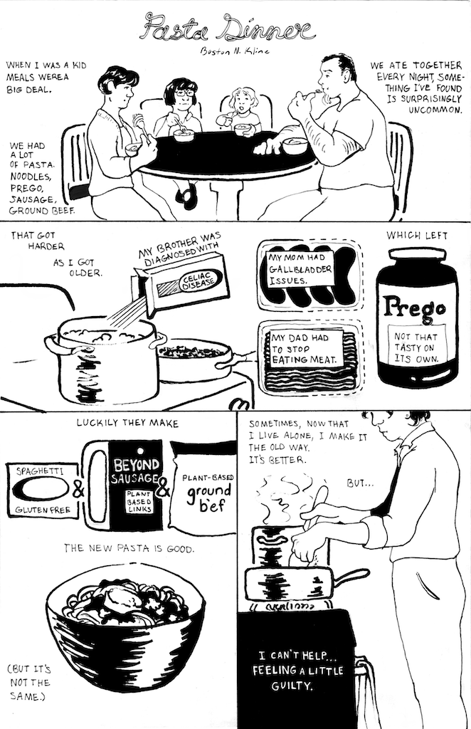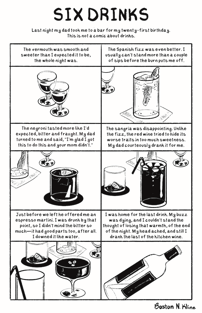 Boston N. Kline CollectionsComicsEditorialCoversAboutHome Comics Multi-Page Capillaries #1 (10p) Unsettlement (4p) To the Woman Working the Dressing Room (4p) Baby (6p) (Your) First Time at a Dungeon (2p) Beach Baby (6p) Single Page Unsettlement. 2025. Six Drinks. 2025. Bridge Closed. 2025. Pasta Dinner. 2025. Moving. 2025. Birds + Bees Alt. 2025. Birds + Bees. 2025. Fasting. 2025. No More Birthdays (The Magnus Archives Fan Comic). 2024. Trans—. 2023. Boston Netterfield-Kline boston.nkline@gmail.com Pages CollectionsComicsEditorialCoversAboutHome Socials Instagram Bluesky